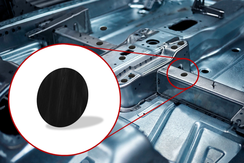 Material automotriz con adhesivo diseñado para cubrir orificios en la carrocería del vehículo. Proporciona sellado confiable y duradero.