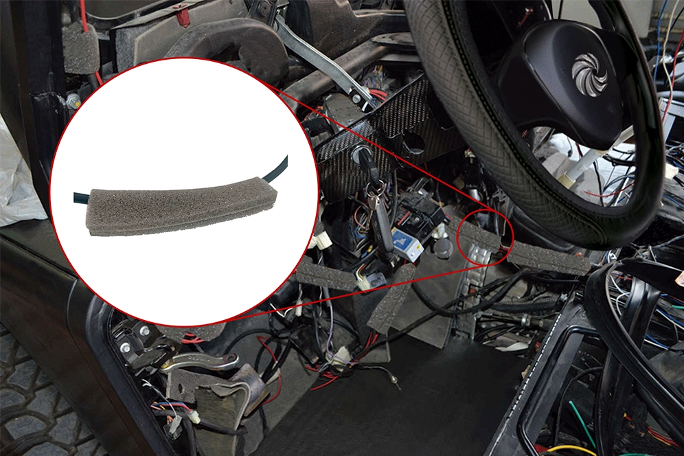 Espuma automotriz con adhesivo para cableado. Arnés y aislante NVH que reduce ruido y vibración en vehículos OEM y Tier 1.